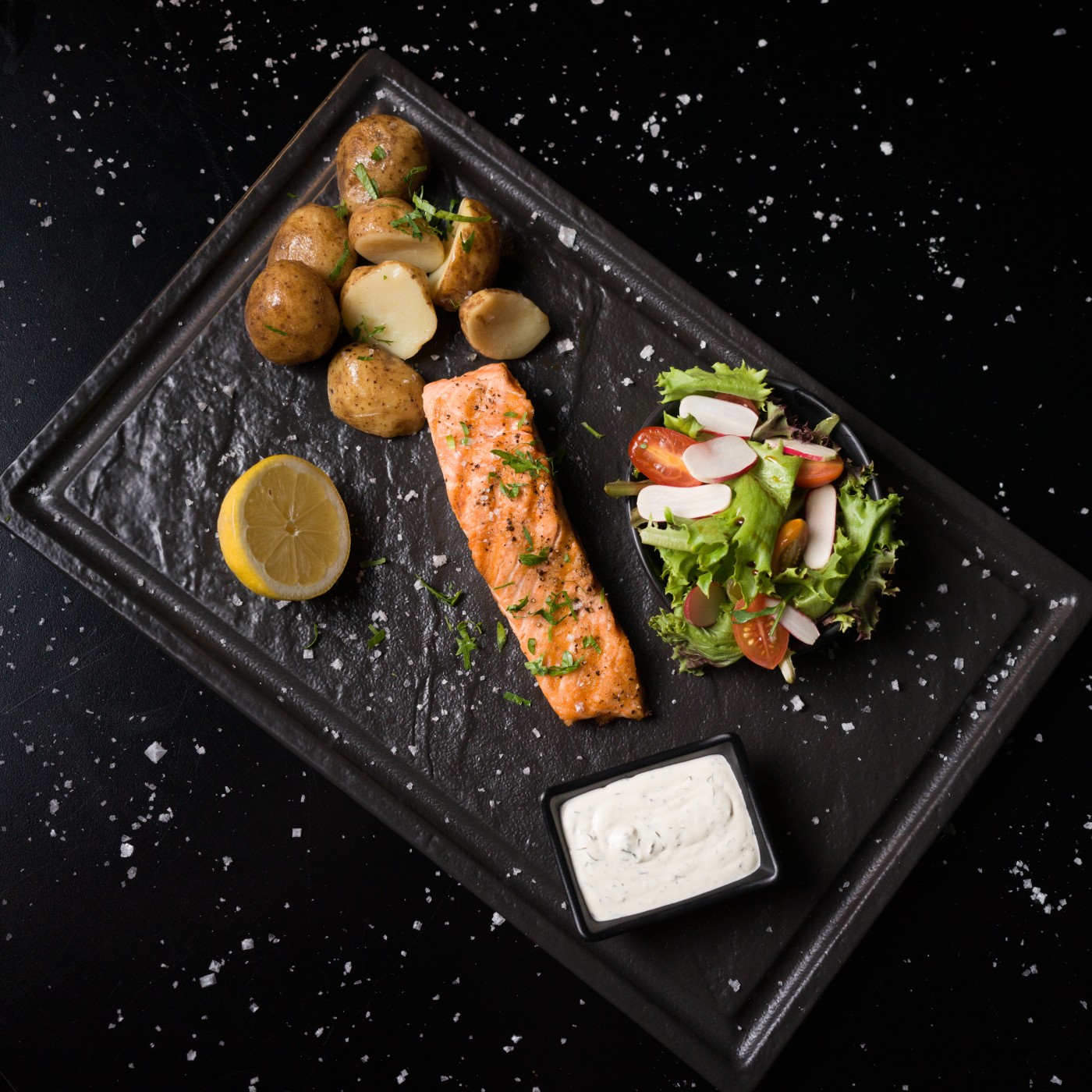 Grillet laks, serveres med salat, kartofler,dild-dressing og citron.