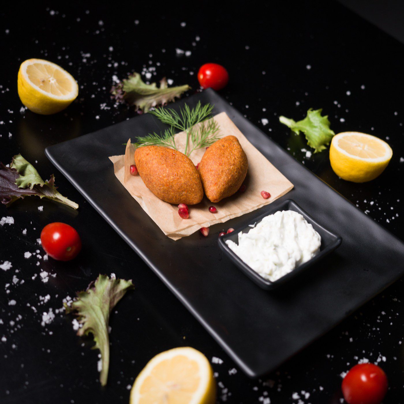 2 stk. Bulgur med fyld (Krydret hakket oksekød, løg og valnødder) Serveres med tzatziki.