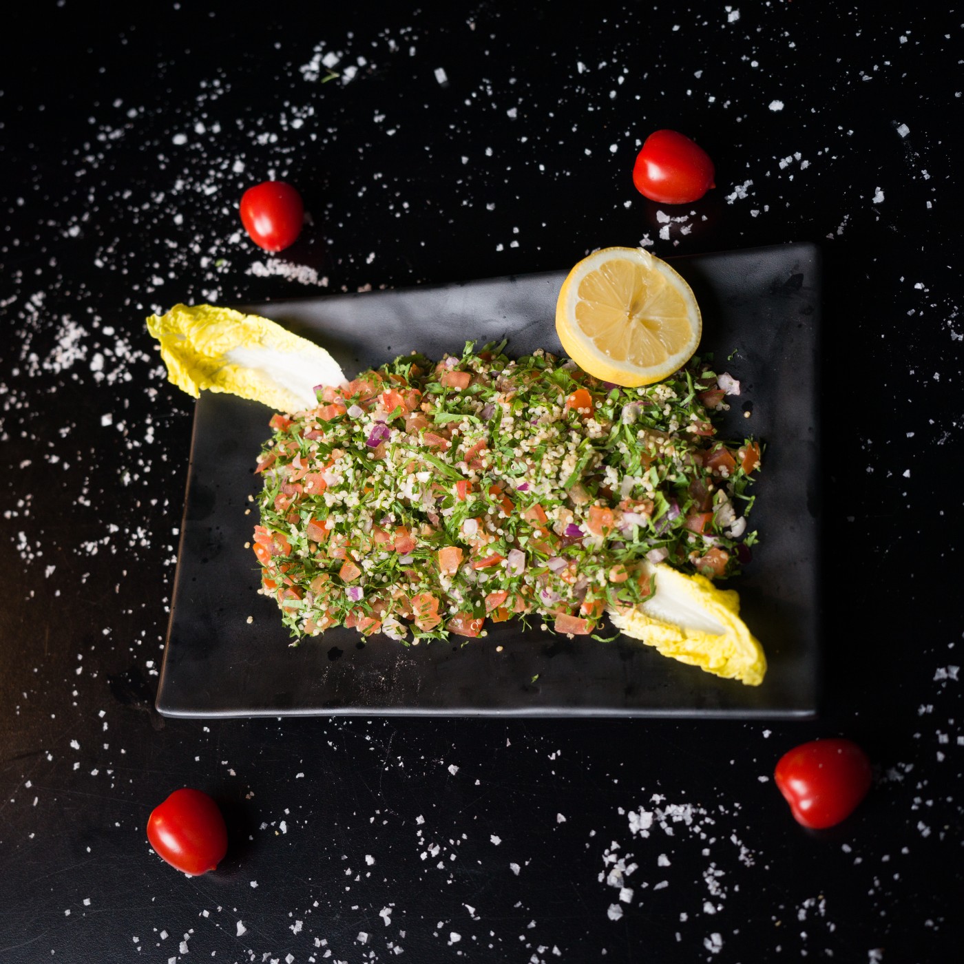 Eksotisk salat af finhakket persille, tomat og quinoa. Tilsmagt med libanesisk vinaigrette.